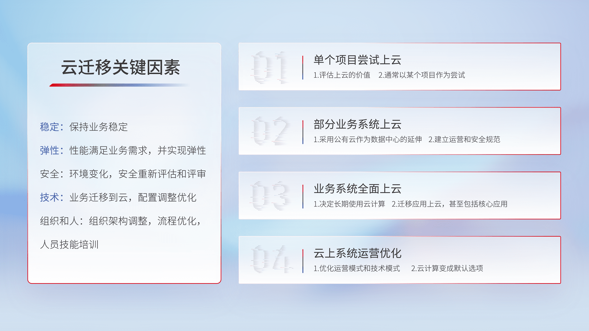 结合实际业务,,从规划设计、、、云平台选型、、、云原生改造、、数据迁移、、、集成交付,,,,迁移全过程为客户识别最佳上云路径,,做好风险识别管理,,,设计网络架构、、身份权限、、、、安全审计合规、、、操作审计、、、、日志审计、、监控告警策略、、多站点容灾设计等,,,对云上基础设施进行整体规划,,,提升IT治理水平,,,以满足弹性、、、高可用、、高性能的需求。。。。