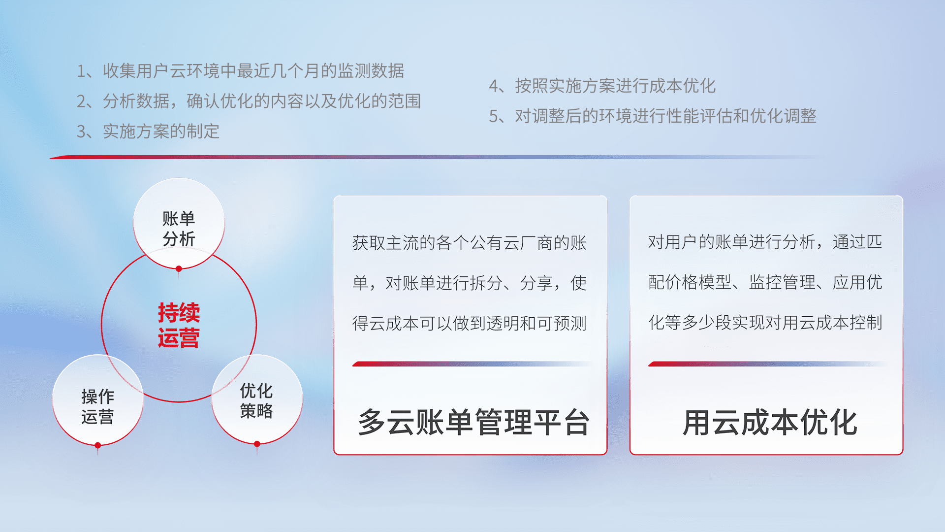 通过多云纳管,,,,以统一的资源数据模型把客户的云资源进行抽象和封装,,,进而实现对多云资源的统一操作,,保障云资源管理的可靠性、、、稳定性与可用性。。。量身定制化运维内容,,,,配置、、开发运维、、、补丁管理、、备份、、、、监控、、认证和访问管理、、、审计和日常巡检等,,,保障在用云过程中的可靠度,,稳定度以及高可用率。。。